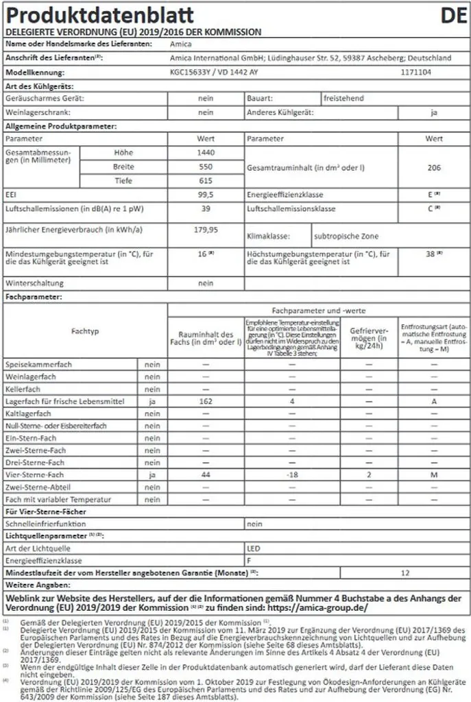 Amica KGC 15633 Y, Kühl-/Gefrierkombination, 208 L, ST, 40 DB, 2,5 Kg/24h, , Farbe Gelb