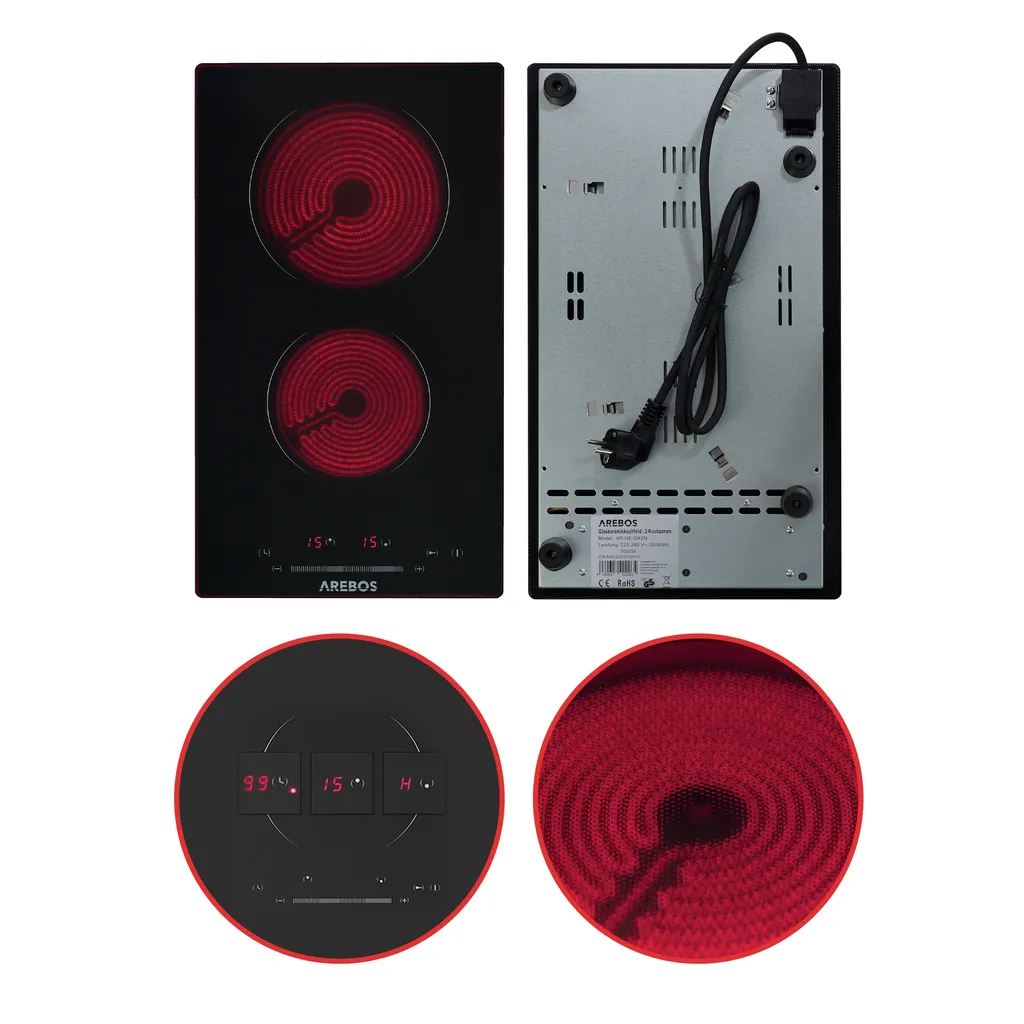 AREBOS Glaskeramikkochfeld, 3000 W, 2 Kochfelder, 30cm, Autark, Mit Sensor Touch