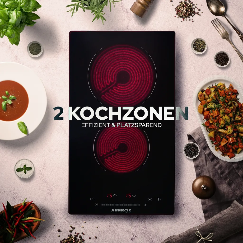 AREBOS Glaskeramikkochfeld, 3000 W, 2 Kochfelder, 30cm, Autark, Mit Sensor Touch