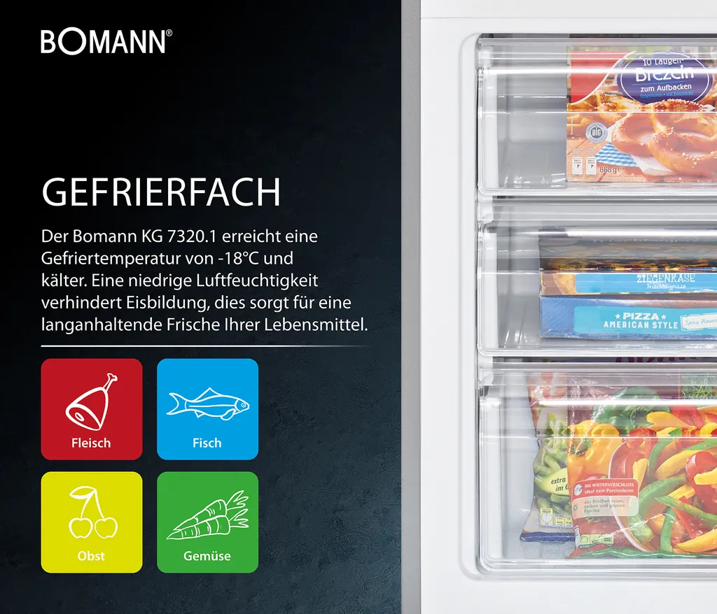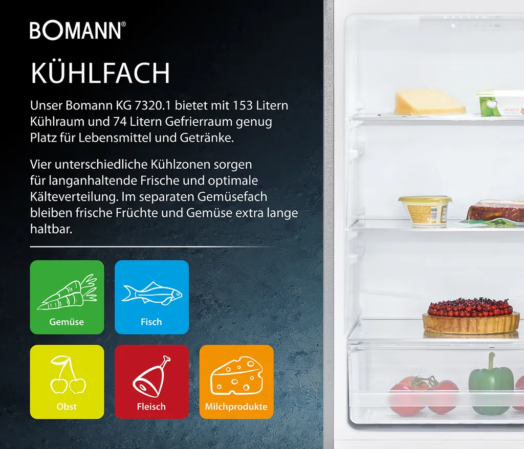 Be the first to review “Bomann Kühl-/Gefrierkombination KG 7320.1 / 227 Liter / No Frost Funktion / 4 Sterne Gefrierfach / Inox” Antwort abbrechen