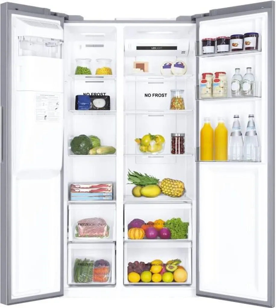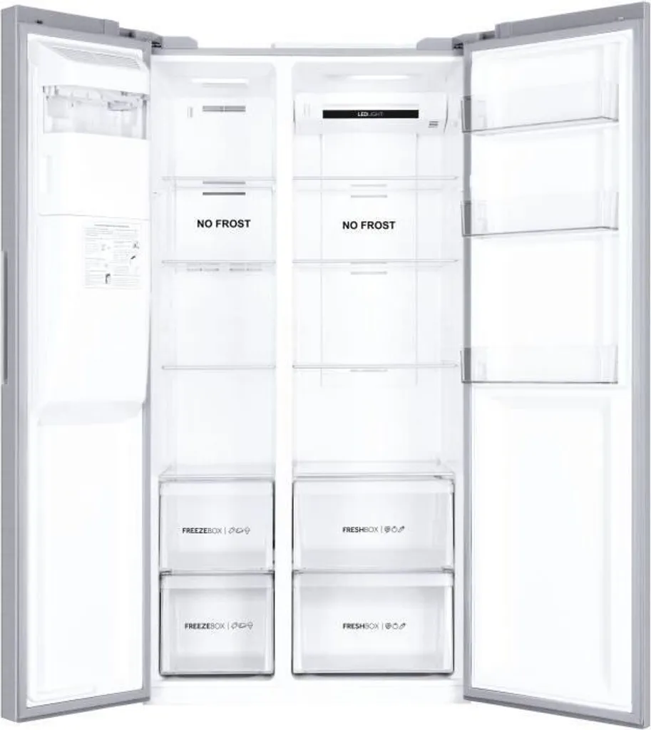 Haier SBS 90 Serie 3 HSOGPIF9183, Freistehend, Amerikanische Tür, Silber, LED, Berührung, An Tür