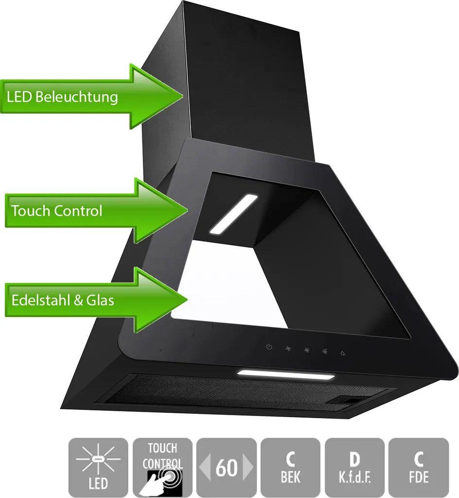 PKM Dunstabzugshaube Wandhaube Design Wandesse P1-60BBTX Schwarz 60 Cm LED