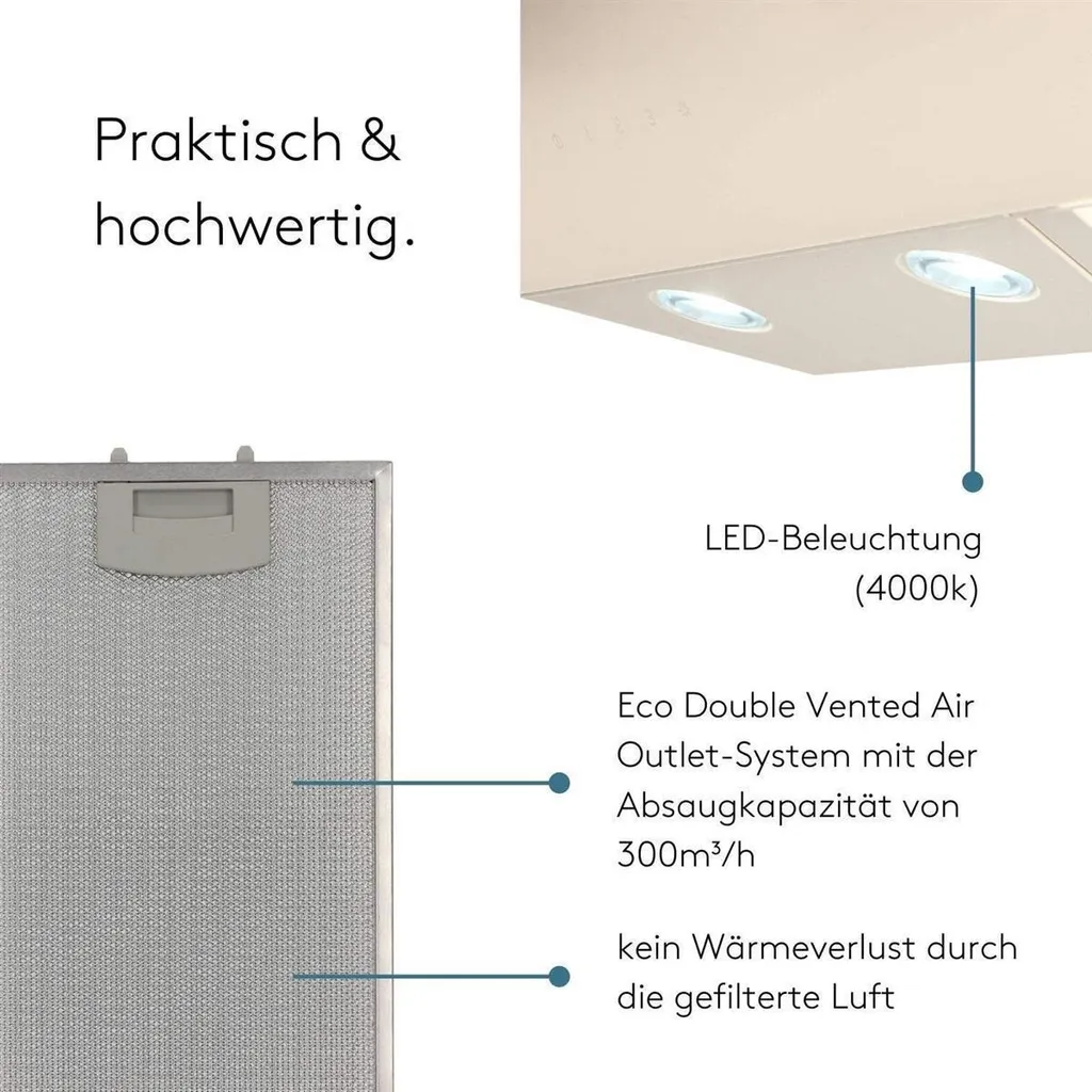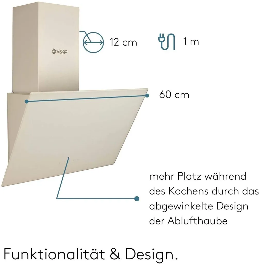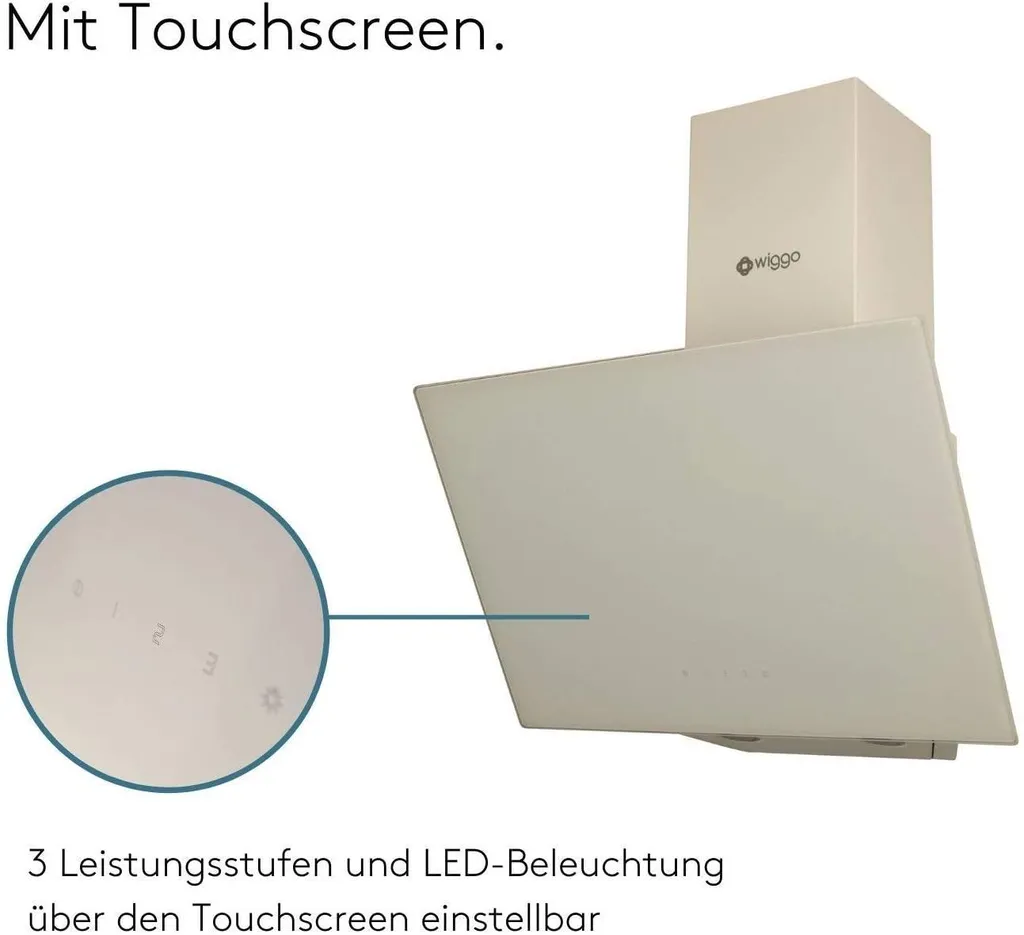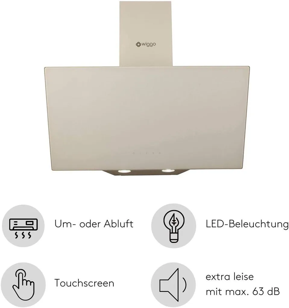 Wiggo Dunstabzugshaube 60cm Kopffrei I Abluft Umluft Dunstabzug 300m³/h – LED Touch-Display 3 Stufen I Schräghaube Inkl. Fettfilter & 2x Kohlefilter I Abzugshaube Mit Glasfront Creme
