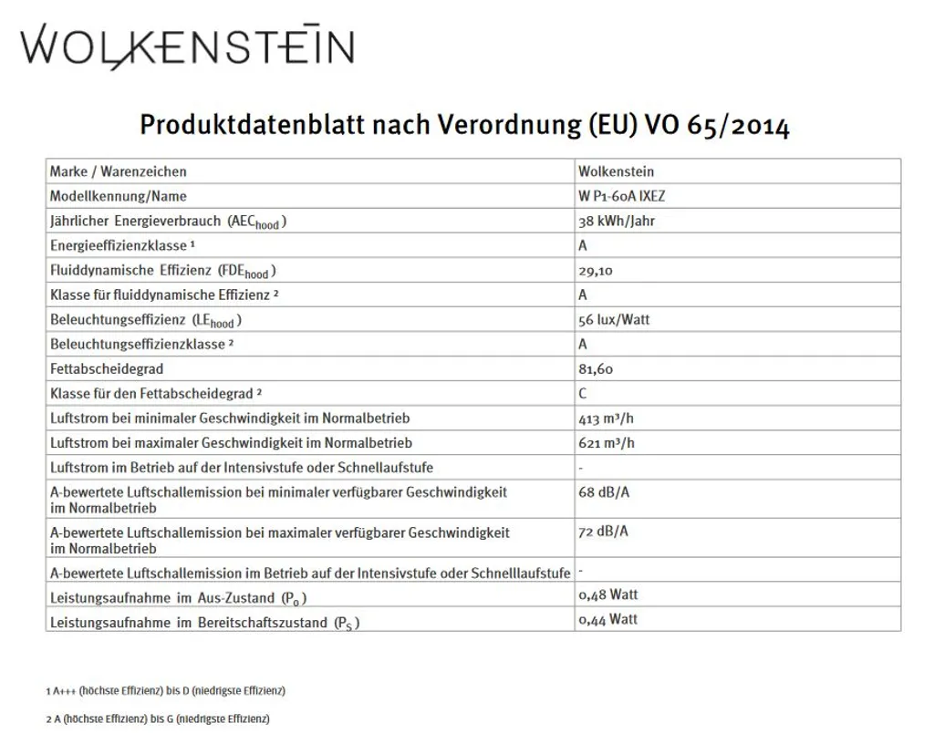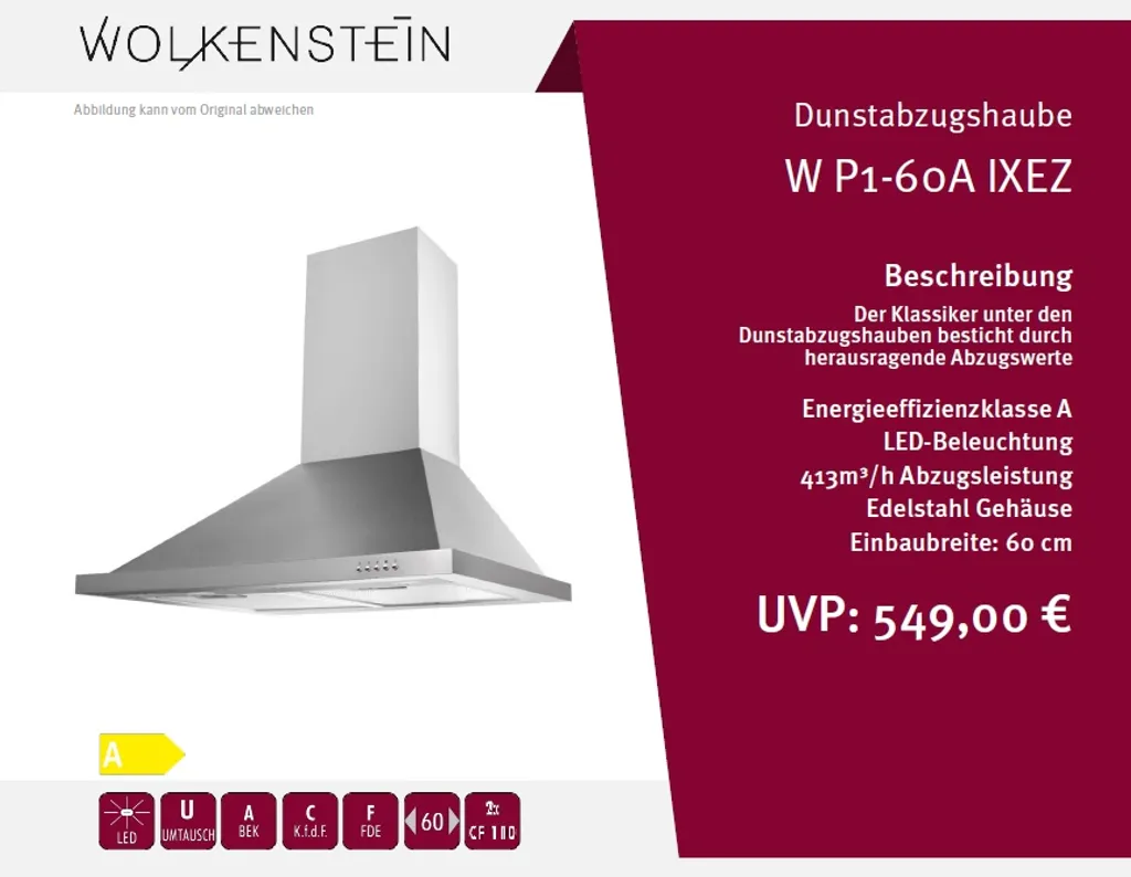 WOLKENSTEIN Dunstabzugshaube Wandhaube Wandesse W PI-60A IXEZ 60 Cm Edelstahl